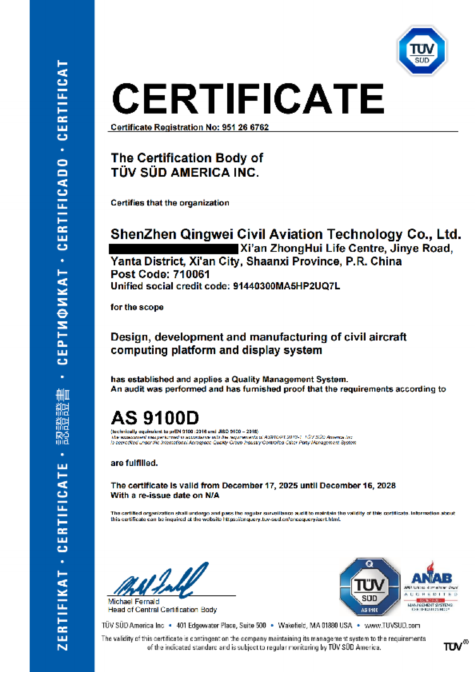 深圳市庆为航空科技有限公司已正式通过国际航空航天领域权威质量标准——AS9100D认证。作为航空航天领域国际上最具公信力的质量标准,AS9100D标准是航空航天行业质量管理的核心,为企业提供了一套严谨且全面的质量管理体系,旨在确保产品的质量、可靠性和安全性。AS9100D相比传统质量标准体系更加聚焦航空航天防务行业核心,强化“安全可靠、合规及持续改进”。通过认证,企业能打开新市场、降低成本,并持续改进质量体系。庆为航空自认证筹备开始,从加强基础保障、规范业务流程、构建质量体系、提升全员质量意识等几个方面着手不断改进;以“全流程覆盖、全要素完善”为原则,统筹推进质量管理体系建设,建立满足行业和局方要求的质量系统。